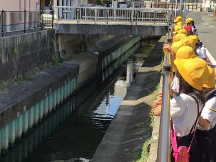 今川校区は、川がいくつもあるので、いろいろなところに橋がかかっています。コイが泳いでいるのも見つけました。