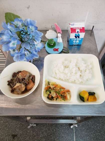 すき焼き煮、焼きかぼちゃ、野菜のそぼろいため
