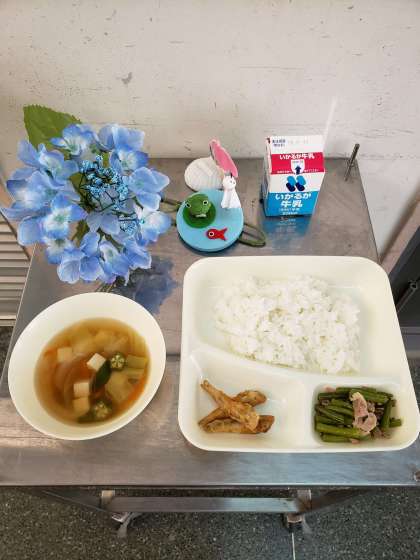 いわしてんぷら、すまし汁、豚肉とさんどまめのいためもの