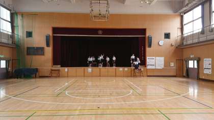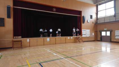 児童集会時に、各委員会が活動内容や、みんなに伝えたいことを発表します。それに向けて、美化委員会の児童が休み時間に集まり、練習に取り組んでいました。