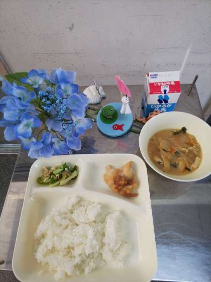 鶏肉のおろしじょうゆかけ、みそ汁、野菜炒め、ごはん、牛乳
