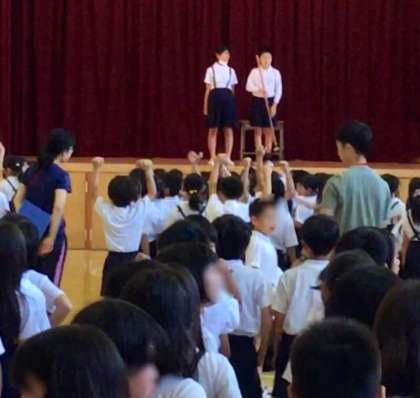 机のはこび方とふき方。ぞうきんのしぼり方とほし方。ほうきの使い方としまい方。クイズに正解した1年生クラスは、バンザイをして喜んでいます。