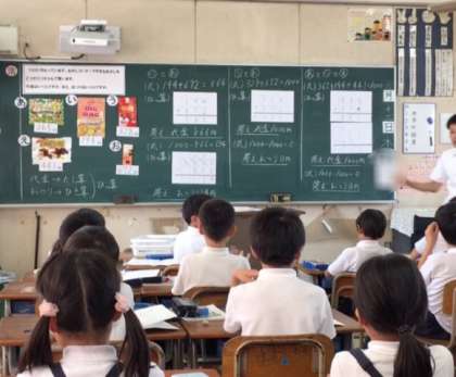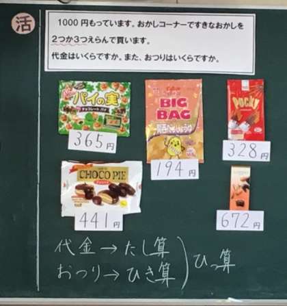 主な指導内容として「1000−3位数の筆算の仕方を考える」をテーマに、お菓子コーナーで好きなお菓子を2つか3つ選んで買う時の、代金とおつりの計算をしました。計算方法について、となり同士で説明し合い、前に出て説明も行いました。