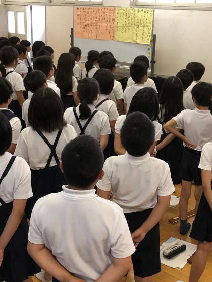 3クラス合同で音楽の授業を行いました。歌うときの姿勢や美しい声の出し方を学習し、「今日から明日へ」を合唱しました。