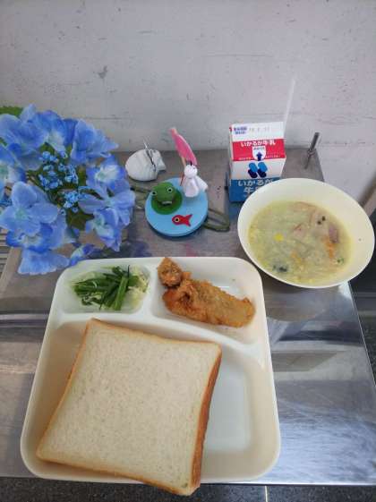 サーモンフライ、豆乳スープ、キャベツとさんどまめのサラダ、りんごジャム、パン、牛乳