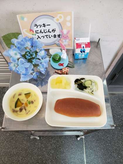 かぼちゃのクリームシチュー、ミックス海そうのサラダ、りんご(カット缶)