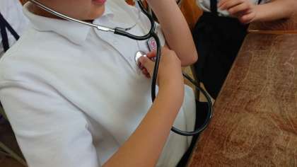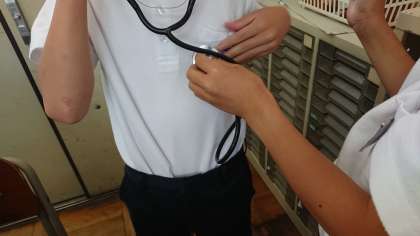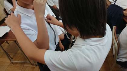 心臓の拍動を調べるために、聴診器を自分や友だちの胸にあてました。すると、子供たちは、微かに聴こえる音を聞くと、静かに(ニヤリ笑) と表情を変え、静かに「おぅ〜〜」と言っていました。