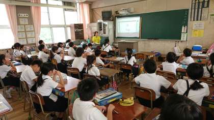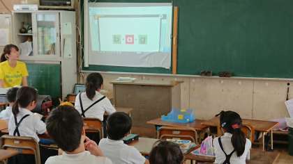 今川イングリッシュタイムでは、デジタル教科書を活用した授業を行っています。子供たちは、声を出したり、体を動かしたりして楽しそうに活動しています。