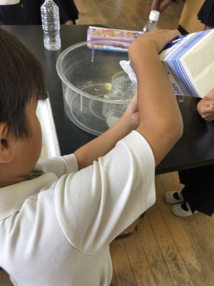 家庭から持ってきたペットボトルや牛乳パックなどのかさも測りました。