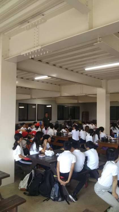 野外炊飯の説明を聞いています。いよいよ自分たちでカレーを作ります。おいしくできるかなー!!