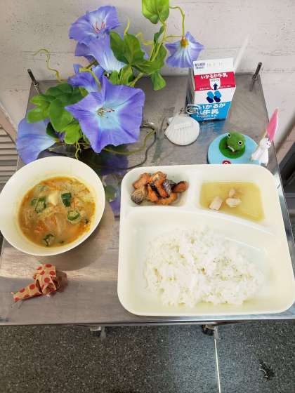さけのつけ焼き、みそ汁、とうがんの煮もの、