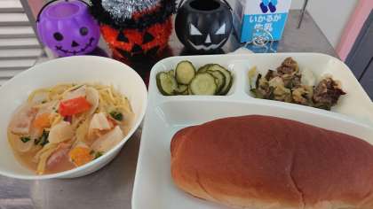 ぎゅうにくのカレー風味焼、トマトのスープスパゲッティ、きゅうりのピクルス