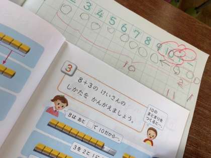1年生の算数では、繰り上がりのあるたしざんの学習をしています。丸を書いたり、さくらんぼ図を使ったりして、答えを求めています。