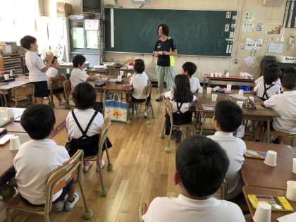 管理作業員さんの山口さんにゲストティーチャーで来ていただき、紙コップのおもちゃを教えてもらいました。