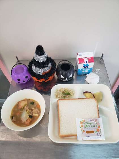 豚肉といかの中華煮、焼きさつまいもの甘みつかけ、もやしとピーマンのいためもの、アプリコットジャム