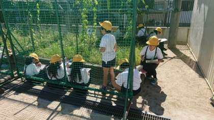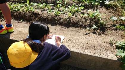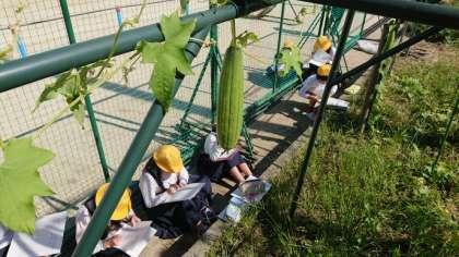 春から育ててきたヘチマを観察しました。太陽の日差しをたくさん浴びた実が、大きく育っているへちまを見てみんな驚いていました。さらに、10月には地域の方に協力いただいて植えた田辺大根の種子が、芽を出しはじめました。