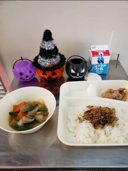 鶏肉のたつたあげ、あつあげと野菜の煮もの、おかかなっ葉