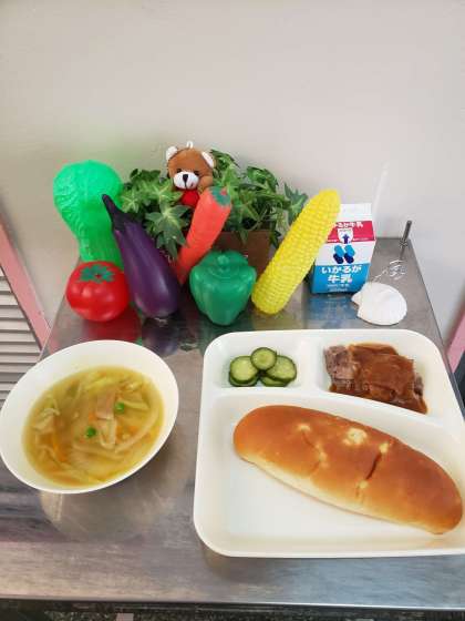 豚肉のデミグラスソース、スープ、きゅうりのサラダ