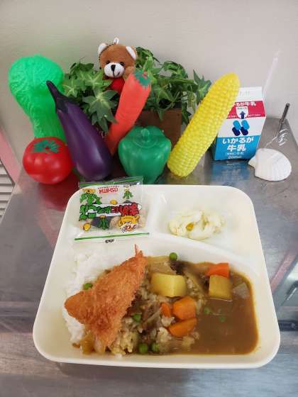 えびフライカレーライス、カリフラワーのピクルス、豆こんぶ