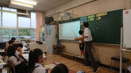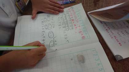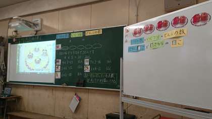 遊園地に乗っている人数を、かけ算での表し方について考えました。図を書いたり、言葉を書いて考えを整理したり、式に書いたりしました。