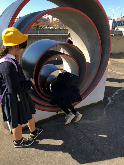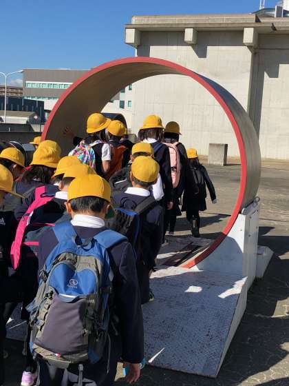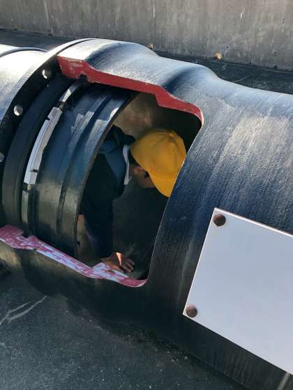 水を輸送する様々な大きさの鋼管です。中をくぐって、大きさを体感しています。