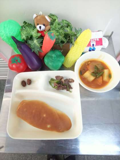 牛肉の香味焼き ケチャップ煮 うずら豆のグラッセ おさつパン 牛乳
