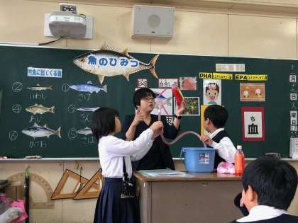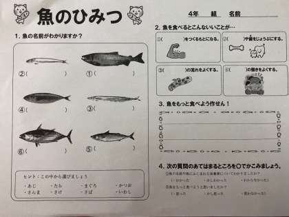 育和小学校から栄養指導に来ていただきました。「魚のひみつ」をテーマに、魚の特徴や含まれる栄養素と働きについて学びました。子どもたちは、「今日の給食のなまりぶしをおかわりする!」とはりきっていました。
