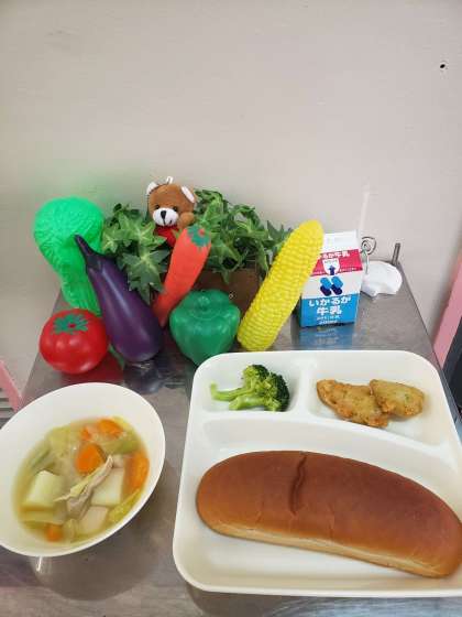 白身魚のフリッター、スープ煮、ブロッコリーのサラダ