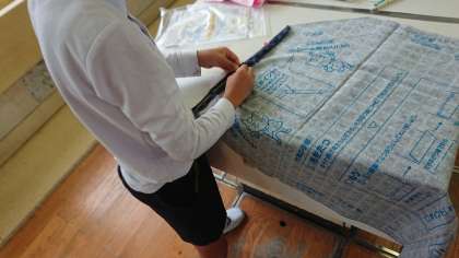 布を裁ちはさみで切ったり、ミシンで縫う部分にまち針をつけたりして、エプロンを作っています。