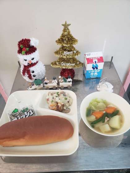 鶏肉とじゃがいものスープ煮、きのこのドリア、ミニフィッシュ