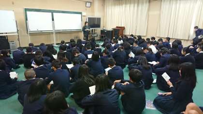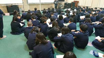 今月の28日にキッザニア甲子園へ、卒業遠足に行きます。そのための説明を多目的室に学年全員が集まって話を聞きました。