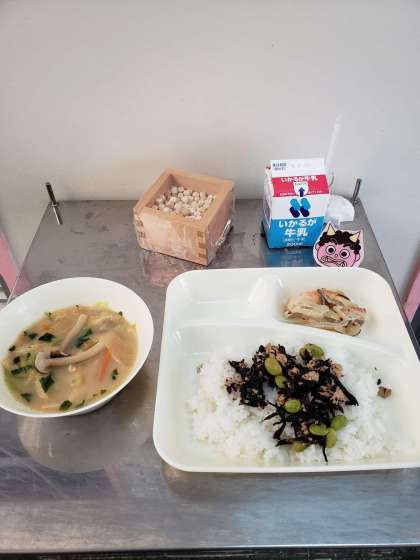 栄養たっぷりえだまめひじきご飯、さけのさわやかレモン焼き、冬野菜のみそ汁