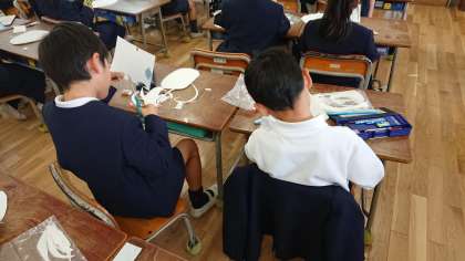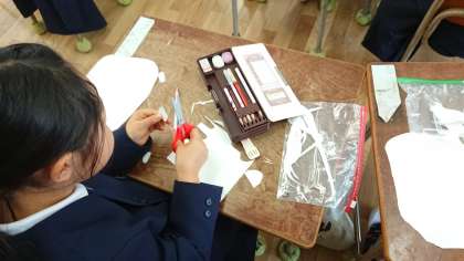 自分の顔を画用紙で作っています。紙を目や鼻や口の形に切り、、貼り合わせながら作りました。
