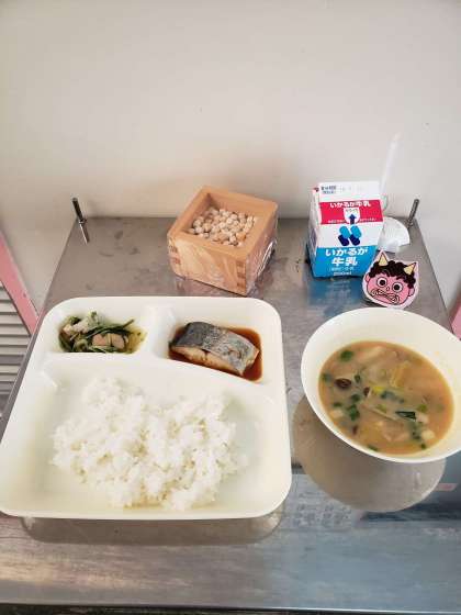 さごしのしょうゆだれかけ、みそ汁、みずなの煮びたし