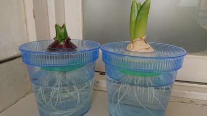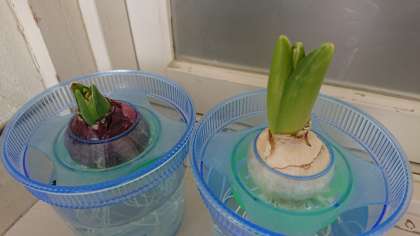 教室の前で、ヒヤシンスを栽培しています。根っこが伸びる様子を休み時間に子どもたちが興味深そうに観察していました。
