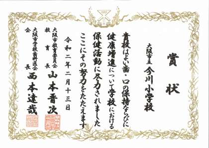 虫歯の予防と治療をきちんとするなど、よい歯・口の保持と健康増進に学校の取り組みの努力が大阪市教育委員会と大阪市歯科医師会から表彰されました。