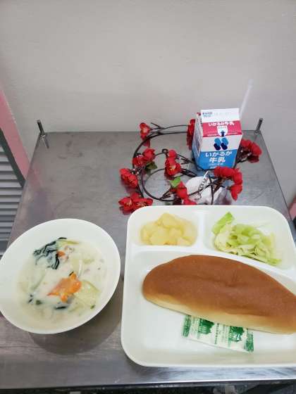 ほうれんそうのクリームシチュー、キャベツのサラダ、洋なし(カット缶)、ソフトマーガリン