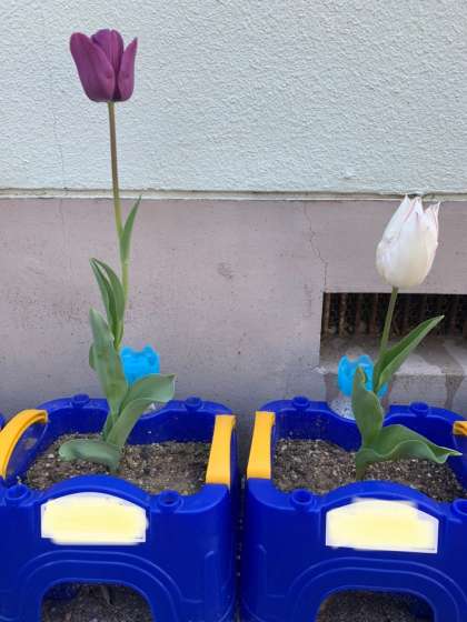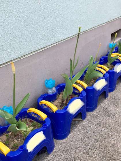みんながたいせつにそだてていたチューリップがさきました!きれいな花がさいたあとは、花がちって、はっぱとくきだけになりました。さくらの木も、あたらしいめが出て、みどりのはっぱがきれいです。早くみんなといっしょにかんさつしたいです。げん気なみんなにあえる日をたのしみにしているよ!