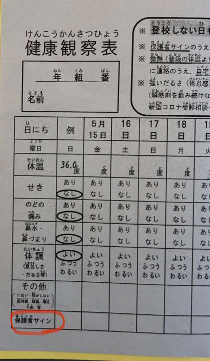 毎日の健康観察をきちんとしていただきありがとうございます。前回配布した表の下にはサインの欄があります。検温等の記入が終わりましたら、サインをお願いいたします。