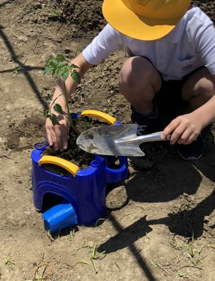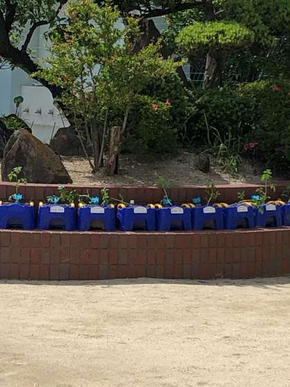 今日は、子どもたちとミニトマトの苗を植えました。子どもたちは、植える時のこつを教室で聞き、約束を守って植えることができました。登校日には、水やりをして、育っていく様子を観察します。