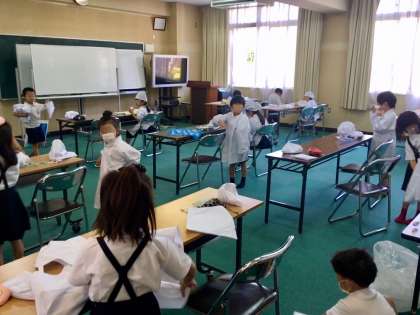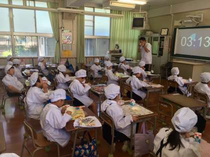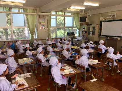 1年生の給食を見学しました。感染に気を付けて、静かに食事をしていました。
