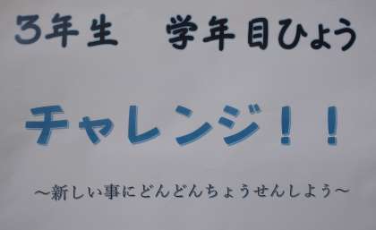 3年生の学年目ひょうは『チャレンジ!!』です。新しい事にどんどんちょうせんして、なりたい自分になれるようにがんばりましょう!
