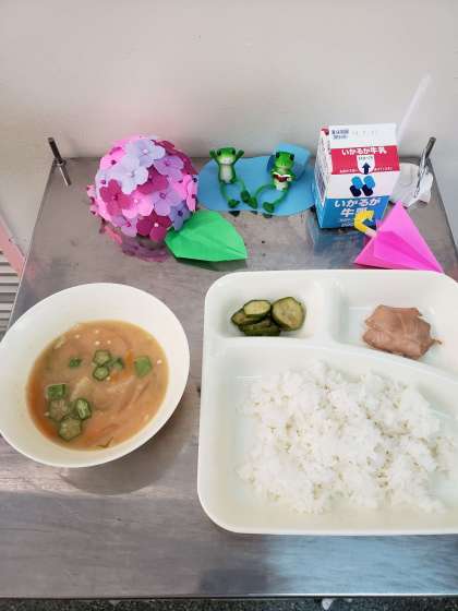 鶏肉のしょうゆバター焼き、みそ汁、きゅうりのあえもの