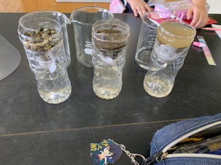 理科の「流れる水のゆくえ」の学習では、土の粒の大きさと水の浸み込み方には関係があるのかを調べる実験をしました。運動場の砂と、砂利を比べると一目瞭然。粒が大きいほど、すぐに水がしみこむことが分かりました。「粒が大きいと隙間があるから、すぐにしみ込むんじゃないかな。」と理由まで考える姿がありました。