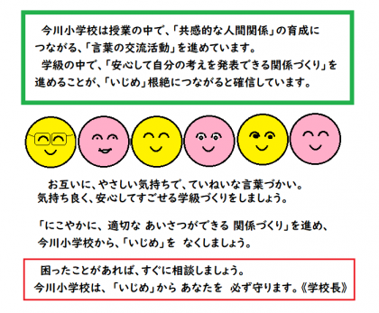 今年度も「学校いじめ防止基本方針」により、地域・保護者・学校全体で