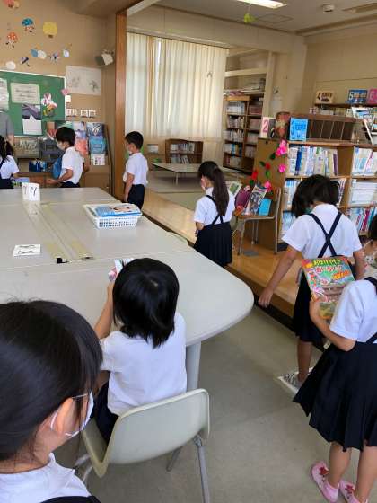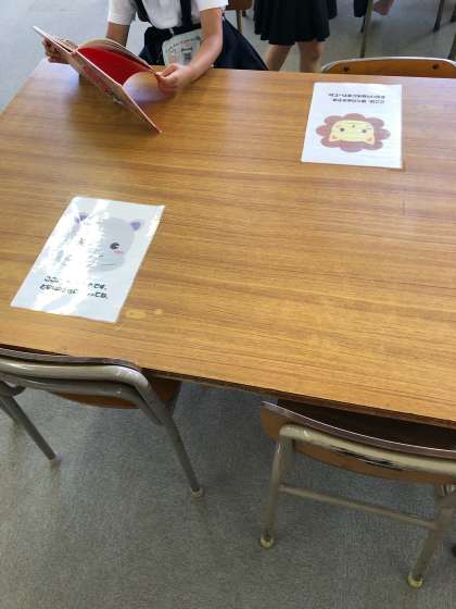 本を読む時や並ぶ時には、学校図書館補助員の先生が作成した座席カードや足跡シートを活用していました。
