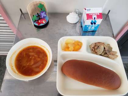 豚肉のカレー風味焼き、ミネストローネ、ミックスフルーツ(缶)