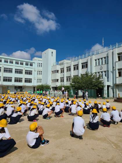 防災避難訓練が始まりました。消防署 区役所 地域 PTAのご協力のもと、今から、体験学習を行います。