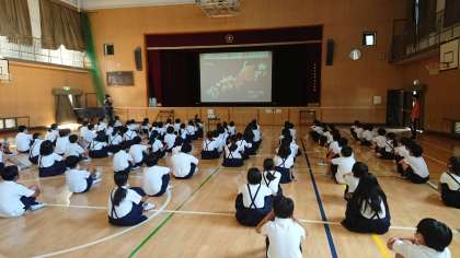 消防署の方のお話を聞いています。まず地震はなぜ起こるのかについて、耳を傾け聞いています。
