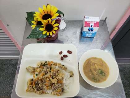 他人丼、とうがんのみそ汁、金時豆の煮もの
